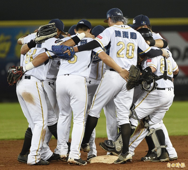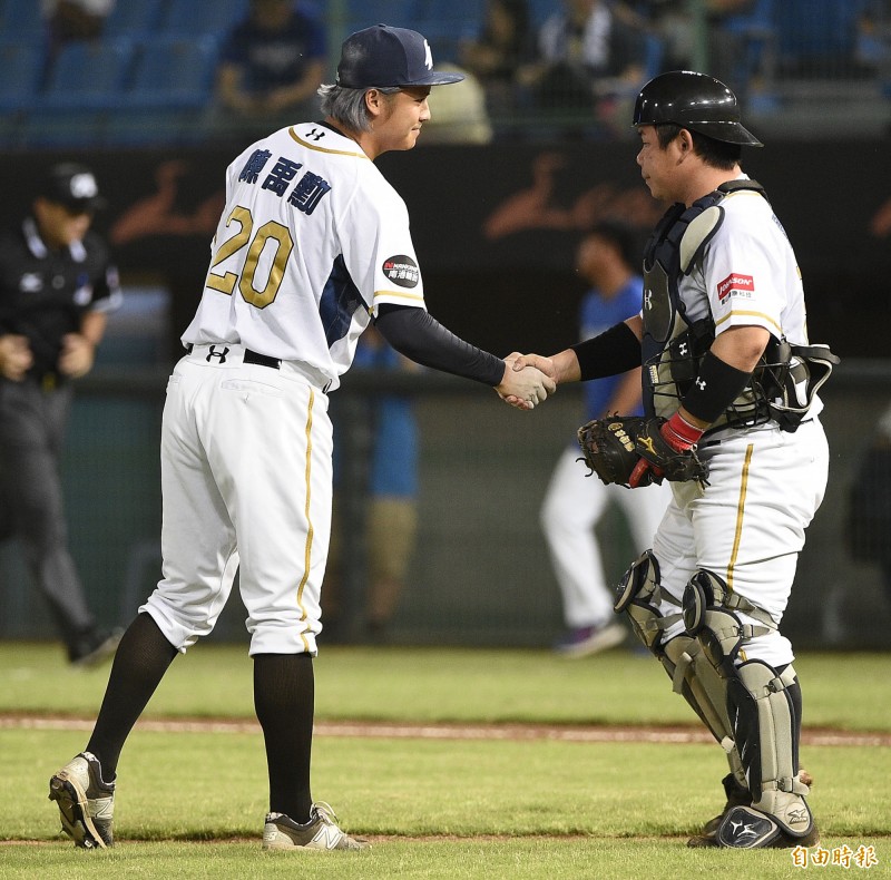 陈禹勋(左)上场救援,成功关门与捕手刘时豪(右)握手致意。(记者陈志曲摄)