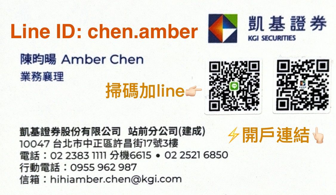 您好,我是凯基证券的旸旸,现正新开户台股还可享有抵用金、美股无低消,不管是个人、公司行号团开,都可帮您争取让您满意的手续费噢!另外,凯基不限用途借贷利率也相当具有竞争优势,欢迎加入我的line私讯聊聊吧。对于每一位客户我都是认真相待,服务地点不限,全台都可为您服务喔(o^^o)