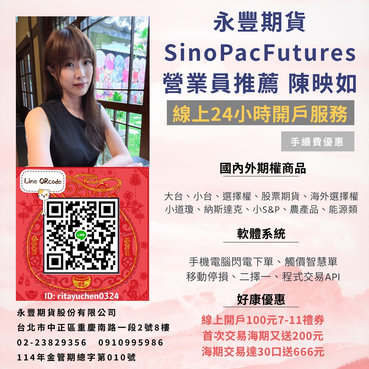 HI,我是永丰金证券资深副理-祥纬,于永丰服务超过10年并连续6年荣获绩优业务,提供API-python量化交易协助,软件面手机&电脑支援触价智慧&闪电下单。*线上开户送7-11商品卡,证券&复委托&期货手续费相当有竞争力,货比三家不吃亏,欢迎洽询。