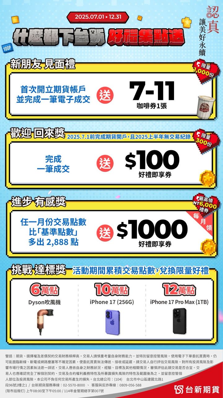 您好,中部元富营业员,台股/期货/复委托/财管,目前公司有活动12月底之前新户交易满100万有1000全联礼券,有任何问题都可以询问,感谢