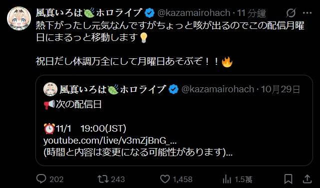 2025-11-01 07:00:00资料来源:https://schedule.hololive.tv/