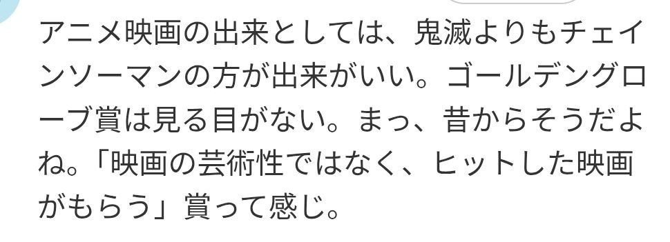 可能拼不太到了,如果在日本冬休也没起色的话,大概拼不到咧,而且最近座位只剩不到4万席,没有像国宝那样鬼神的入座率,这样一周会卖不到1亿日币了鬼灭入围金球,得奖机率也不高,得奖机率不高,日媒大概也不会多关注,所以大概也不会造成多大的讨论,日媒跟日本电影相关业界还在期望国宝入围奥斯卡(远目
