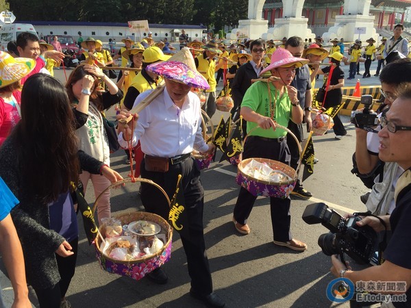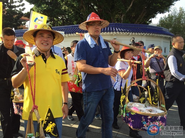 ▲连胜文和台北市长郝龙斌一起挑扁担。(图/记者黄瀞莹摄)