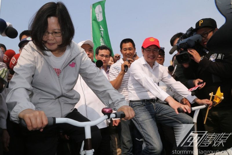 (图)民进党党主席蔡英文参加反核游行,试踩人力脚踏车发电