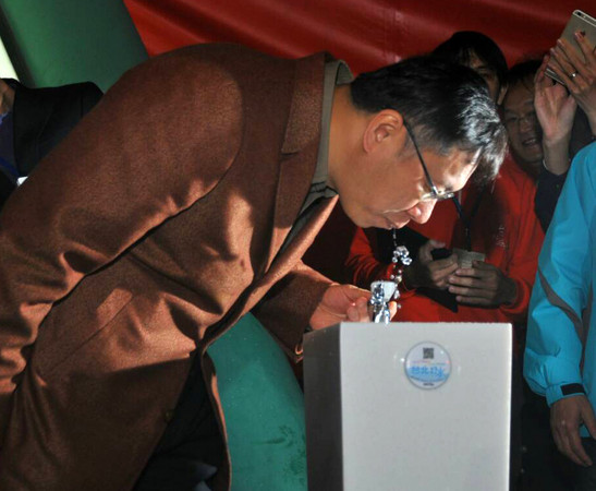 柯文哲打开饮水机,直接就喝起水来,因为他希望自来水可以干净到让市民安心喝,但也