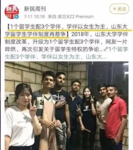 2019 年 7 月时,中国网络上盛传山东大学“为每位留学生配 3 位学伴,学伴以女性为主”的消息。山东大学国际事务部在 7 月 7 日针对网络消息发表声明称,学伴活动合法正当,自由报名,不存在强制,但中国的网民显然还是无法接受。到了今年的 10 月 30 日,有一名网名“山大留学生”,头像为非洲裔黑人的微博帐号发文“欢迎来中国,白吃、白喝、白嫖”,同时附上一张 3 位非洲男留学生与 3 位中国女学生合照的照片。这段贴文在网络上流传后又引起了轩然大波。