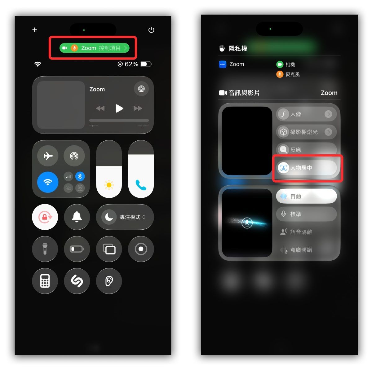 视讯状态下,从右上滑出控制中心,人物居中关掉试试看
